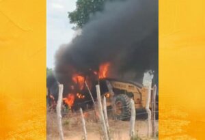Incêndio destrói parte de motoniveladora da Prefeitura de Conceição do Almeida na zona rural