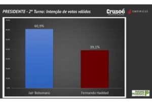 A vantagem de Jair Bolsonaro (PSL) no primeiro turno tornou-se ainda maior (veja aqui), de acordo com uma pesquisa divulgada pela revista Crusoé/ Instituto Paraná Pesquisas nesta quarta-feira (17). No segundo turno, o candidato do PSL à Presidência da República tem 60,9% das intenções de votos válidos no questionário espontâneo contra 39,1% de Fernando Haddad (PT).