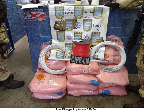 Junto com o motorista, identificado como Edikson Jardim Silva, a guarnição flagrou uma carga de 300 kg de explosivo granulado, 500 metros de cordel detonante e 150 conjuntos montados de estopim espoleta.