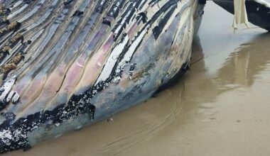 Um filhote de baleia jubarte com aproximadamente com 12 metros de comprimento foi achado morto em uma praia de Valença,…