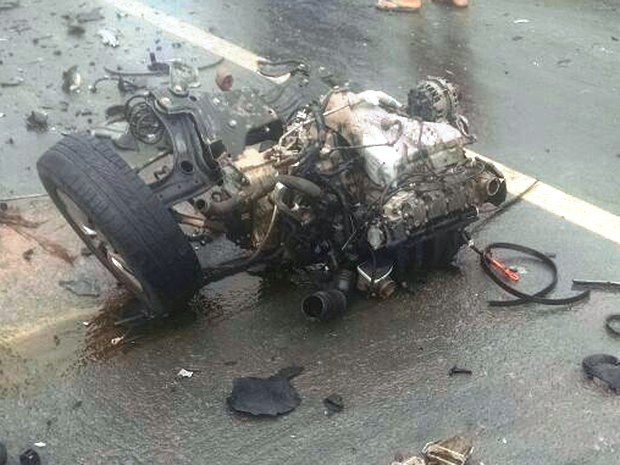 A colisão foi tão forte que partes de um dos veículos envolvidos, como rodas, ficaram espalhadas na pista. Um dos carros caiu em um barranco às margens da rodovia. Chovia no momento do ocorrido.