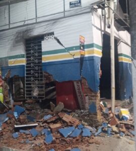 A pequena agência, que funciona como um posto de atendimento do Bradesco, ficou destruída, mas o único caixa eletrônico, apesar de danificado, não foi totalmente detonado pelos explosivos, o que dificultou que os criminosos levassem o dinheiro do equipamento.