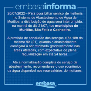 A Embasa informa que haverá suspensão no abastecimento de água nesta quinta (21/07) nas cidades de Cachoeira, São Félix e Muritiba. (Diário da Notícia)