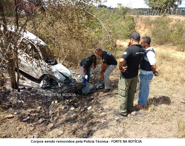 A Polícia Técnica esteve no local e especulou a possibilidade de o veículo ter sido jogado no barranco junto com as vítimas, antes de ser incendiado. “Vamos investigar o caso com cuidado”, disse um perito durante entrevista ao #ForteNaNotícia.