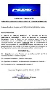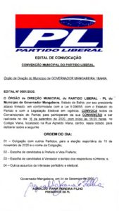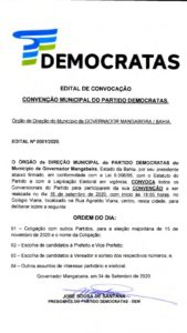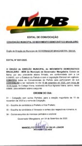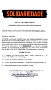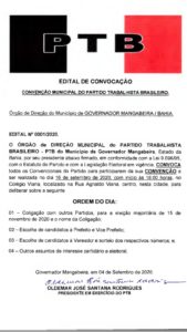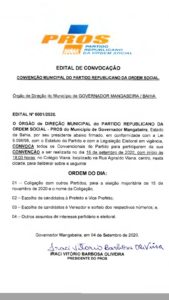 Atendendo a Legislação Eleitoral os Partidos PP, DEM, PL, MDB, PROS, PTB, Solidariedade e PSDB solicitaram, no último dia 04/09, a este órgão de imprensa, a publicação dos Editais de Convocação de suas respectivas Convenções para o próximo dia 16/09/2020, às 18 horas, no Colégio Viana.