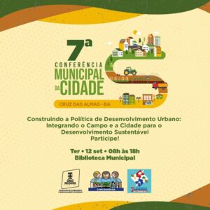 No próximo dia 12, será realizada a 7ª Conferência Municipal da Cidade. O evento é organizado pela Prefeitura de Cruz das Almas, por meio da Secretaria de Planejamento e Desenvolvimento Econômico e vai acontecer na Biblioteca Municipal Carmelito Barbosa Alves, das 8 às 18 horas.