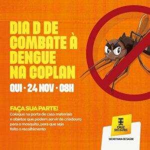 Nesta quinta (24) a Prefeitura de Cruz das Almas, através da Secretaria Municipal de Saúde, vai realizar o Dia D de Combate à Dengue no bairro da Coplan, a partir das 8h. O objetivo é evitar a proliferação do mosquito Aedes aegypt, transmissor de doenças como dengue, chickungunya e zica, e, também, chamar à atenção da população de outros bairros sobre a importância da ação.